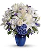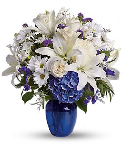 Brighten the home with the peace and beauty of a bright blue sky. This beautiful bouquet pairs pure white flowers with deep blue blooms in a gorgeous blue glass vase.