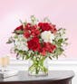 A cylinder of red and white flowers.