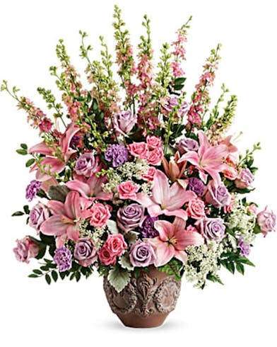 A beautiful flower arrangement in an urn with shades of pink flowers.