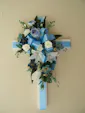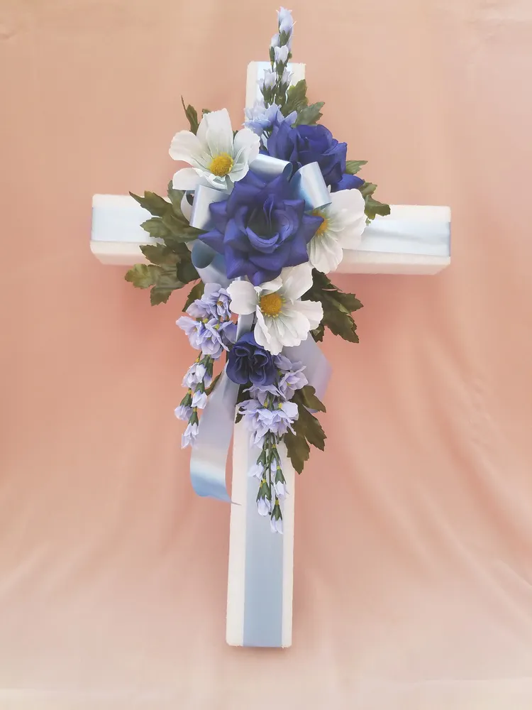Silk flowers arranged on a styrofoam cross for the cemetery.