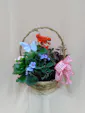 Mixed flowering and green plants in a basket.