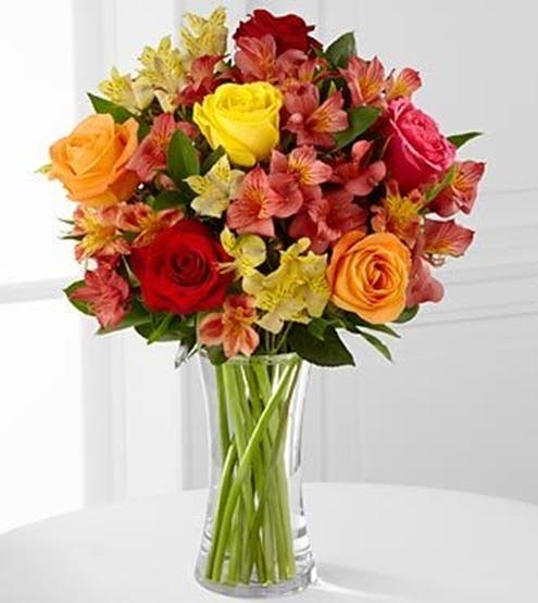 A clear vase of bright colored alstromeria and roses.