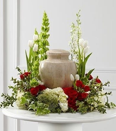 A .All around tribute for a cremation urn in assorted flowers.