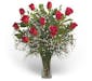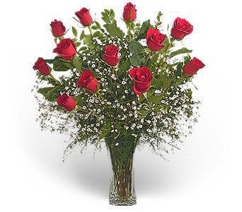 One dozen of the finest roses carefully hand selected and arranged in all their natural beauty in a glass vase with greens and filler.