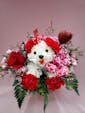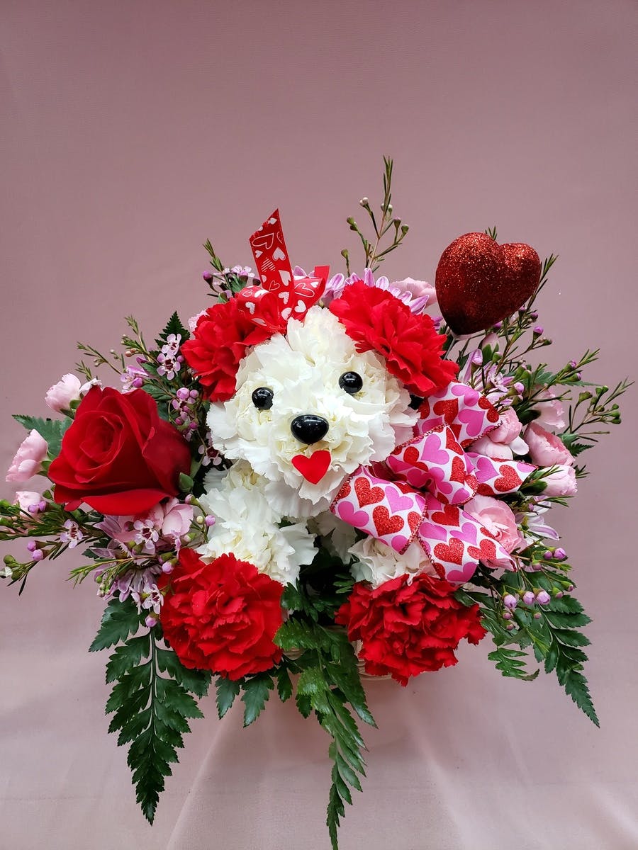An adorable puppy made with carnations. You may choose the color of flowers that your sweetheart would prefer.