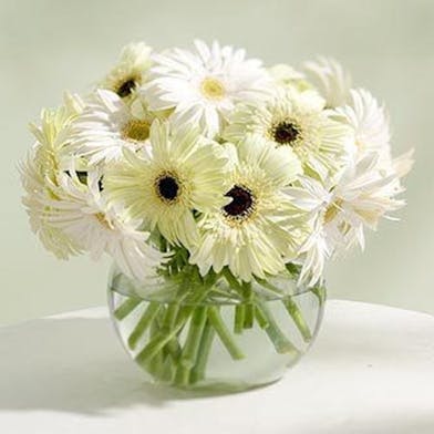 Winter white gerbera daisies in it's natural form in a bubble bowl .