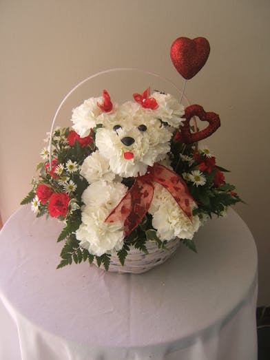 An adorable puppy made with carnations. You may choose the color of flowers that your sweetheart would prefer.