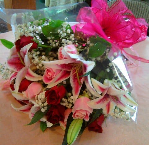 Pink and red roses with lilies and other mixed flowers wrapped as a hand tied bouquet.