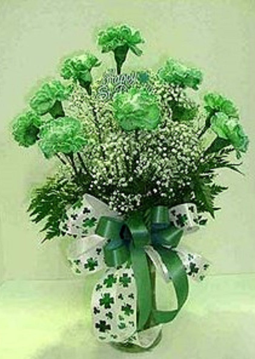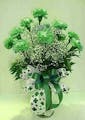 Send a dozen festive green carnations arranged in a glass vase with baby's breath. A St. Patty's Day Favorite!