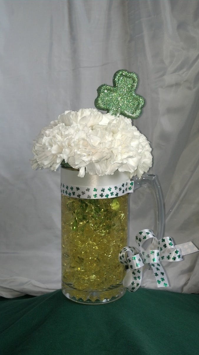 This mug of blooms is crafted from the freshest white carnations in a glass beer mug. This St. Patty's day why not "toast" someone special.