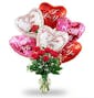 A vase of a dozen red roses with 6 I love you mylar balloons.